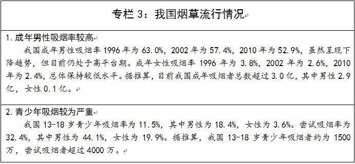 吸烟导致多种疾病,严重危害公众健康,是我国面临的最突出的公共卫生问题之一。近年来,我国烟草控制工作取得了积极进展,吸烟率出现下降趋势,公众对烟草危害健康的认识有所提高。但是我国吸烟人数多,烟草产量大,烟草危害重,烟草控制工作面临严峻挑战。加强烟草控制任务非常紧迫、意义十分重大。为全面推进我国烟草控制工作,减少烟草危害,保护公众健康,特制定本规划。规划期为2012-2015年。