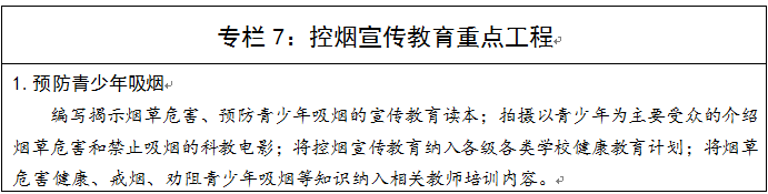 3.强化控烟宣传教育的针对性和有效性。针对重点潜在吸烟人群,要组织开展“预防青少年吸烟”、“女性远离烟草”、“转变吸烟习俗”等专项宣传教育活动。发挥各领域知名公众人物的示范带动作用,提高控烟宣传教育的影响力。要强化对控烟宣传教育工作的评估、考核和奖励,保障控烟宣传教育持久深入开展。