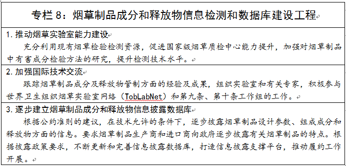 (六)建立完善烟草制品成分管制和信息披露制度1.制订烟草制品成分管制措施。加大烟草制品检测力度,加强烟草控制科学和技术研究,借鉴国际先进经验和做法,提出检测烟草制品成分和燃烧释放物的方法、标准和程序,制订符合我国实际的烟草制品成分管制措施。