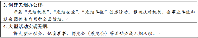 3.加快无烟环境创建步伐。全面启动无烟环境创建工程,率先创建无烟医疗卫生机构、无烟学校、无烟办公楼。不断扩大公共场所禁止吸烟覆盖范围,努力实现大型活动无烟,逐步实现室内公共场所、公共交通工具和室内工作场所全面禁止吸烟。