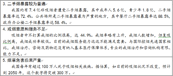 (一)吸烟人口数量众多,烟草危害后果严重我国吸烟者人数众多,吸烟和二手烟暴露十分普遍。目前成年吸烟人数超过3.0亿,男性吸烟率达52.9%,居于世界前列。青少年吸烟状况不容乐观,现有13-18岁青少年吸烟者约1500万,尝试吸烟者超过4000万,青少年吸烟率达11.5%。公共场所、工作场所吸烟现象严重,有7.4亿非吸烟者遭受二手烟暴露,暴露率达72.4%。吸烟和二手烟暴露导致癌症、心血管疾病和呼吸系统疾病等大量发生,每年死于吸烟相关疾病的人数超过100万,吸烟产生的医疗费用不断增加。