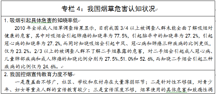 我国控烟宣传教育覆盖面不够广、针对性不够强,社会公众对烟草危害的认识不足,大多数人未能全面了解吸烟对健康的危害,尤其是对吸烟或二手烟暴露会引起中风、冠心病以及多种恶性肿瘤等严重疾病的知晓率低,相当数量的人尤其是青少年没有充分认识到吸烟的具体危害和致瘾性。此外,“以烟送礼”、“以烟待客”现象较为普遍,尚未形成不送烟、不敬烟、不吸烟的社会风气。