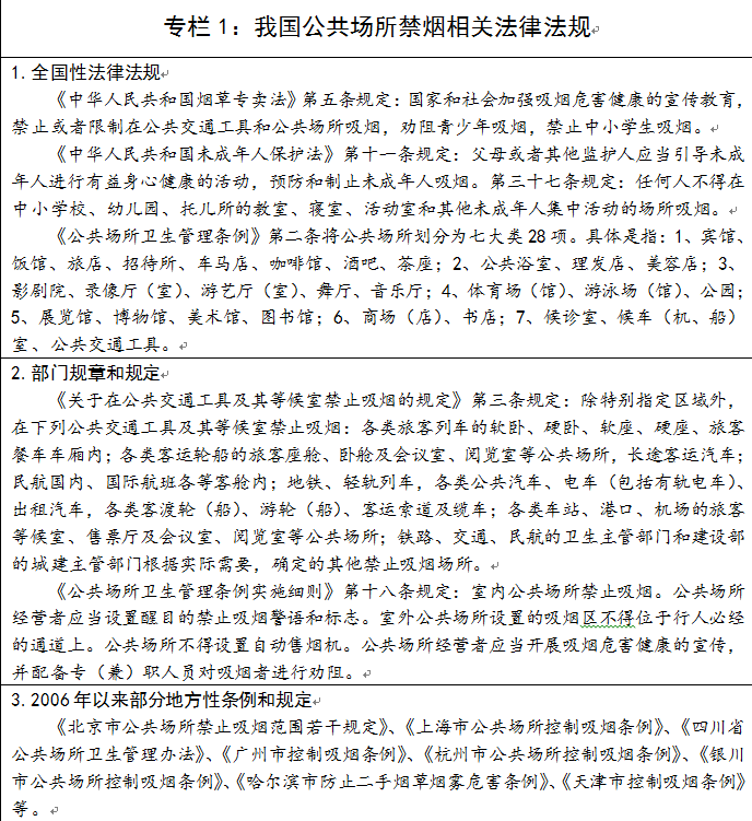 (一)全面推行公共场所禁烟1.健全公共场所禁烟法律法规。评估我国公共场所控烟法律法规的实施成效,研究制定全国性公共场所禁烟法律规定。推动地方加快公共场所禁烟立法进程,制定出台公共场所禁烟法规。修订完善部门控烟规章和措施,加快构建多部门综合控烟政策体系。