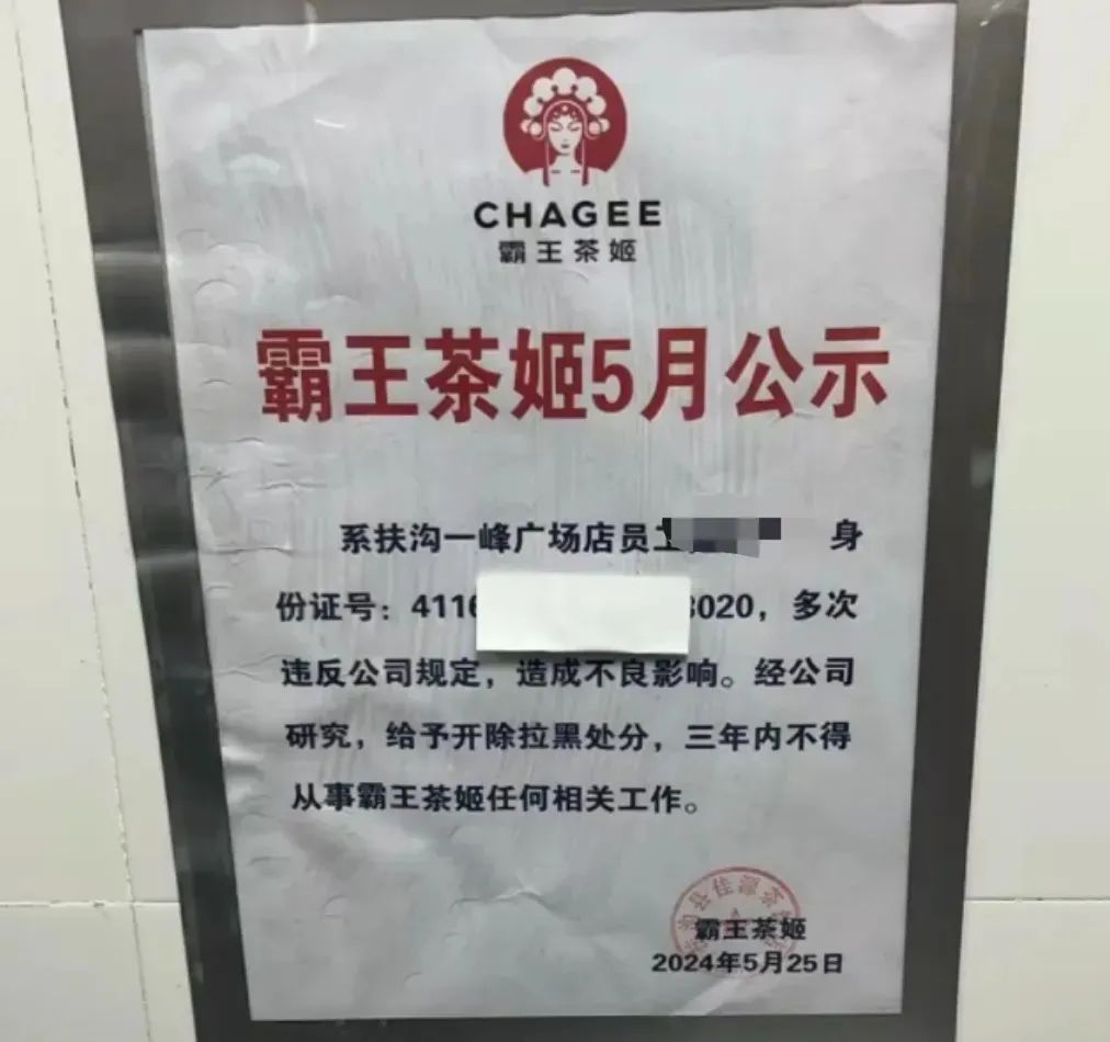 7月14日,河南周口一名女子在社交平台发文称,自己从霸王茶姬离职后,被店方张贴身份证号公示,还表示上班时就被店长打压。从截图中可以看到,公示上写着:扶沟一峰广场员工,多次违反公司规定,造成不良影响,经公司研究,给予开除拉黑处分,三年内不得从事霸王茶姬任何相关工作。