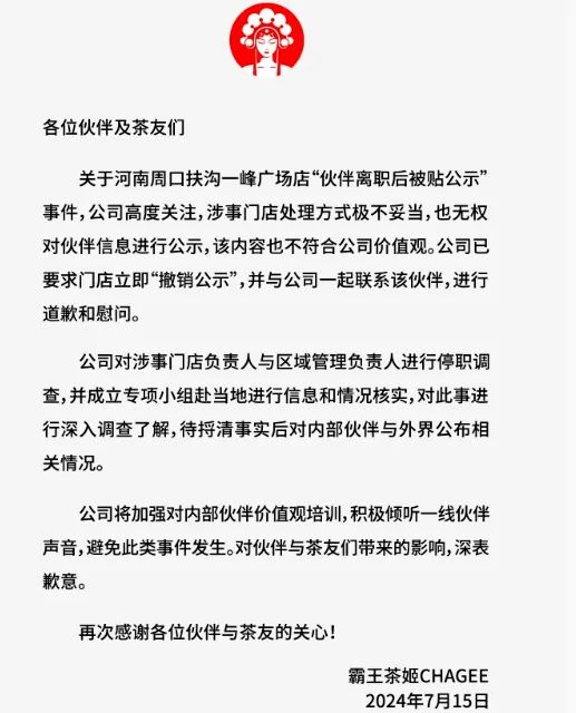 随着舆论发酵,霸王茶姬官方账号于15日发文称,公司已要求门店立即“撤销公示”,对涉事门店负责人与区域管理负责人进行停职调查,并成立专项小组赴当地进行信息和情况核实,并要求门店“与公司一起联系该伙伴,进行道歉和慰问”。