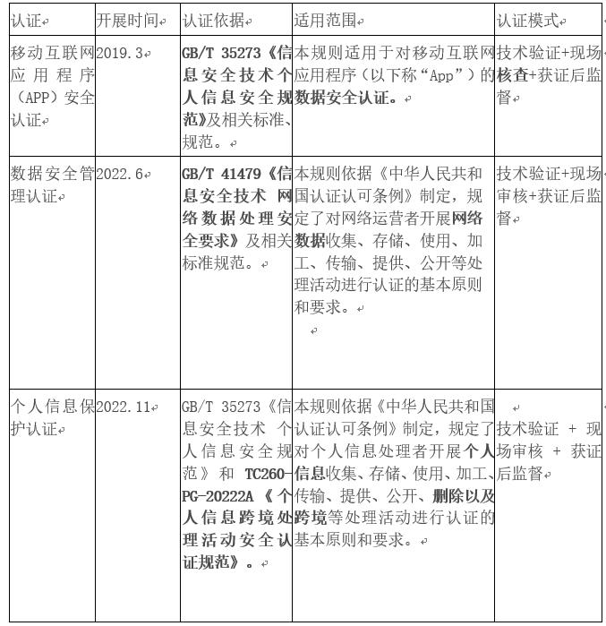 梳理发现,目前我国数据安全认证制度的框架日渐完善,已经建立了App个人信息保护认证、数据安全管理认证、个人信息保护认证3种数据安全认证制度。