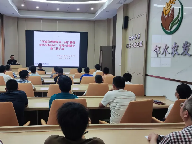 近日,邻水县河长制办公室围绕“河流管理新模式·河长制引领环保新风尚”主题,在邻水县农发集团举办河湖长制“七进”进企业宣传活动。