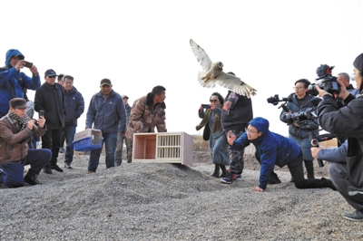 身穿红色马甲的志愿者、前来观摩的小学生和家长、扛着长枪短炮的鸟类摄影爱好者,在等待一场放飞活动。