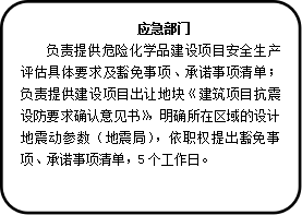 6、应急部门:负责提供危险化学品建设项目安全生产评估具体要求及豁免事项、承诺事项清单;负责提供建设项目出让地块《建筑项目抗震设防要求确认意见书》,明确所在区域的设计地震动参数(地震局),依职权提出豁免事项、承诺事项清单,5个工作日。