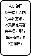 14、人防部门:配合园区完成人防区域评估、实施。负责提供人防建设、人防质量监督备案受理的具体要求、收费标准,依职权提出豁免事项、承诺事项清单,5个工作日。