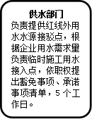 10、供水部门:负责提供红线外用水水源接驳点,根据企业用水需求量负责临时施工用水接入点,依职权提出豁免事项、承诺事项清单,5个工作日。