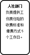 15、人社部门:负责提供工伤责任险的收费标准和缴费方式,5个工作日。