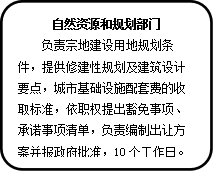 3、自然资源和规划部门:负责宗地建设用地规划条件,提供修建性规划及建筑设计要点,城市基础设施配套费的收取标准,依职权提出豁免事项、承诺事项清单,负责编制出让方案并报政府批准,10个工作日。