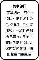 9、供电部门:在拿地开工前介入项目,提供线上办电和临时用电租赁服务,一次性告知办电流程,5个工作日内提供项目红线内管线信息、临时基建用电电源点。