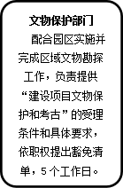 16、文物保护部门:配合园区实施并完成园区区域内文物调查勘探工作。负责提供“建设项目文物保护和考古许可”的受理条件和具体要求,明确收费标准、缴费方式,依职权提出