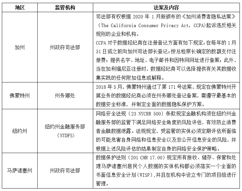 在州政府层面,不同州的法案赋予不同部门(多为州政府司法部门或下设机构)不同的监管权力,一些主要的相关州立法律以及监管部门如下表2所示: