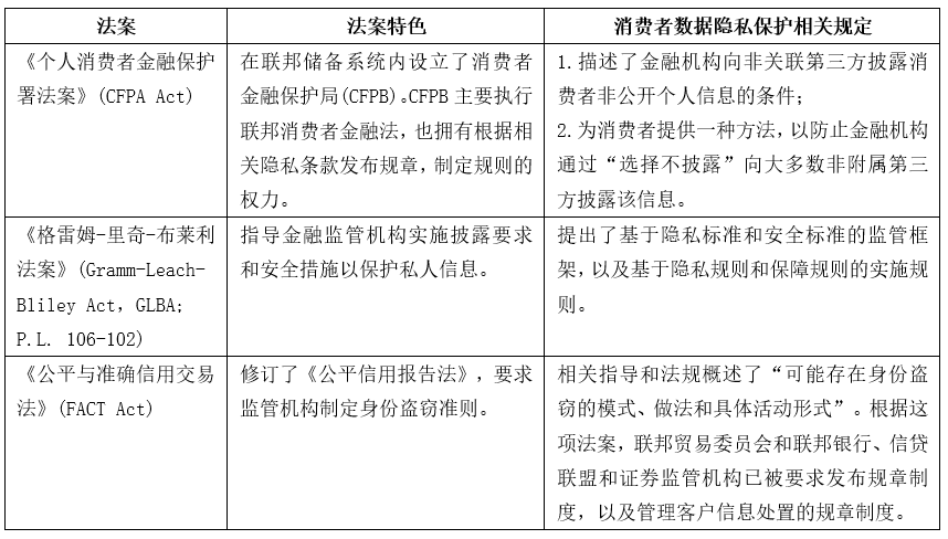 作为个人数据隐私以及金融隐私监管最为严格的国家之一,美国在联邦政府和州政府层面均有出台相关的法案和非约束性指导原则,其具体监管框架较为复杂且处于不断发展的状态。相关的监管原则以及指导方针分布于不同的法律法规之中,赋予了联邦层面和州层面的个人数据监管机构和金融监管当局规范数据机构行为的权利。在美国从事经营活动的数据机构需要同时考虑其在联邦层面和所在州州政府层面的数据隐私合规问题。