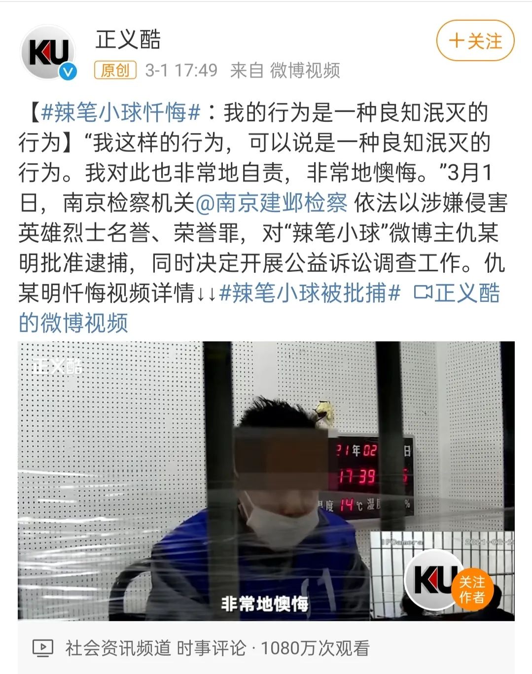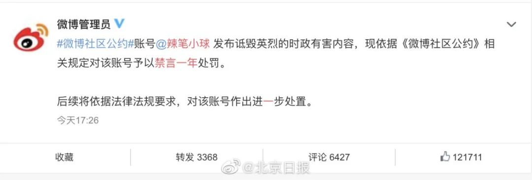 2021年3月1日,江苏省南京市检察机关通报,依法以涉嫌侵害英雄烈士名誉、荣誉罪,对“辣笔小球”微博博主仇某明批准逮捕,同时决定开展公益诉讼调查工作。