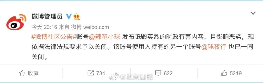 近日,喀喇昆仑5位戍边英雄官兵英勇战斗现场画面首次披露,感动无数国人。而微博账号@辣笔小球却发布侮辱毁谤英雄烈士言论,引起公众强烈不满。