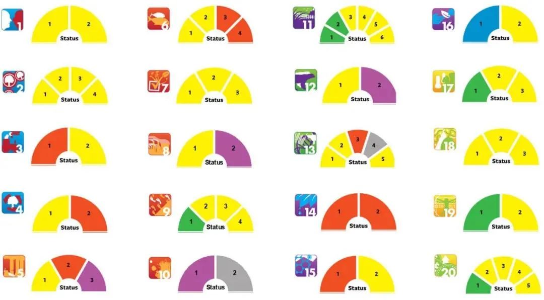 2010年“爱知目标”提出的20项目标的完成情况。图中半圆表示各个要素的进展,蓝色表示超过要素,绿色表示到2020年可能或已经实现,黄色表示取得进展但尚未实现,红色表示没有显著变化,紫色表示偏离要素。图源自第五版《全球生物多样性展望》。