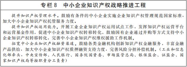 提升创新主体知识产权管理效能。推动创新主体加强知识产权管理标准化体系建设,推动实施创新过程知识产权管理国际标准。推动中央企业建立完善知识产权工作体系,打造一批具备国际竞争优势的知识产权强企。深化实施中小企业知识产权战略推进工程。分级分类开展企业、高校、科研院所知识产权优势培育和建设工作。引导创新主体建立健全知识产权资产管理制度,推动企业做好知识产权会计信息披露工作。建立健全财政资助科研项目形成知识产权的声明制度和监管机制。(教育部、科技部、工业和信息化部、财政部、国务院国资委、税务总局、市场监管总局、中科院、国家知识产权局等按职责分工负责)