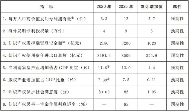 《规划》指出,坚持质量优先、强化保护、开放合作、系统协同,到2025年,知识产权强国建设阶段性目标任务如期完成,知识产权领域治理能力和治理水平显著提高,知识产权事业实现高质量发展,有效支撑创新驱动发展和高标准市场体系建设,有力促进经济社会高质量发展。《规划》提出知识产权保护迈上新台阶、知识产权运用取得新成效、知识产权服务达到新水平、知识产权国际合作取得新突破等四个主要目标,设立“每万人口高价值发明专利拥有量”等八个主要预期性指标。