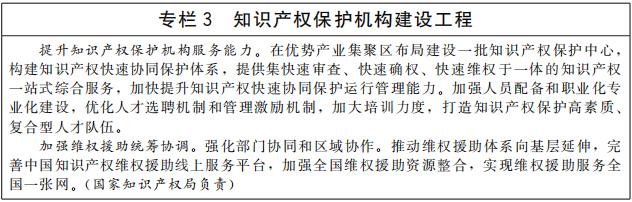 健全知识产权行政保护机制。加强中央在知识产权保护的宏观管理、区域协调和涉外事宜统筹等方面事权。加强知识产权快保护机构建设。在条件成熟的地区建设国家知识产权保护试点示范区。加强知识产权行政执法指导制度建设。建立行政保护技术调查官制度。健全知识产权侵权纠纷行政裁决制度。健全跨区域、跨部门知识产权行政保护协作机制。加强商贸流通领域知识产权保护,制定商品交易市场知识产权保护国家规范,持续推进知识产权保护规范化市场建设,净化消费市场。(国家知识产权局牵头,中央宣传部、文化和旅游部、市场监管总局等按职责分工负责)