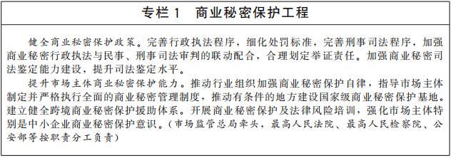 健全知识产权法律法规。开展知识产权基础性法律研究。统筹推进专利法、商标法、著作权法、反垄断法、科学技术进步法、电子商务法等相关法律法规的修改完善。加强地理标志、商业秘密等领域立法,出台商业秘密保护规定。完善集成电路布图设计法规。推进修订植物新品种保护条例。制定中医药传统知识保护条例。完善与国防建设相衔接的知识产权法律制度。全面建立并实施知识产权侵权惩罚性赔偿制度,加大损害赔偿力度。研究建立健全符合知识产权审判规律的特别程序法律制度。适应科技进步和经济社会发展需要,依法及时推动知识产权法律法规立改废释。(中央宣传部、最高人民法院、最高人民检察院、科技部、工业和信息化部、司法部、农业农村部、商务部、国家卫生健康委、市场监管总局、国家国防科工局、国家林草局、国家中医药局、国家知识产权局、中央军委装备发展部等按职责分工负责)
