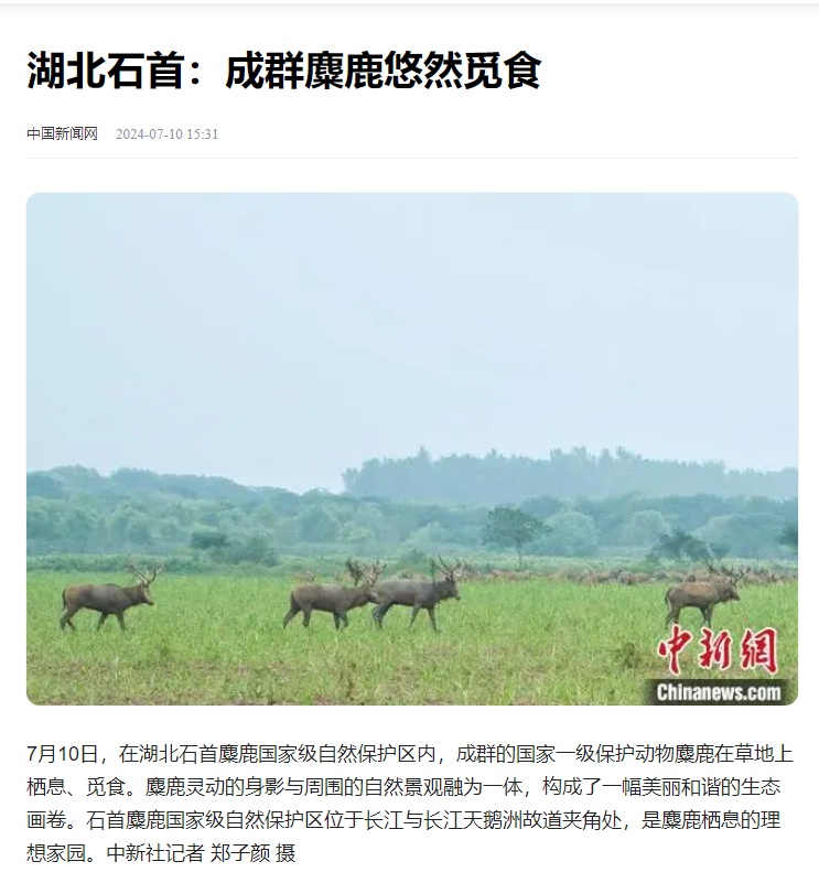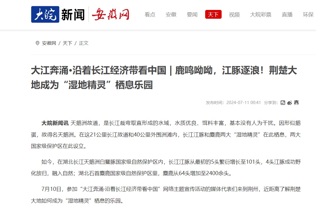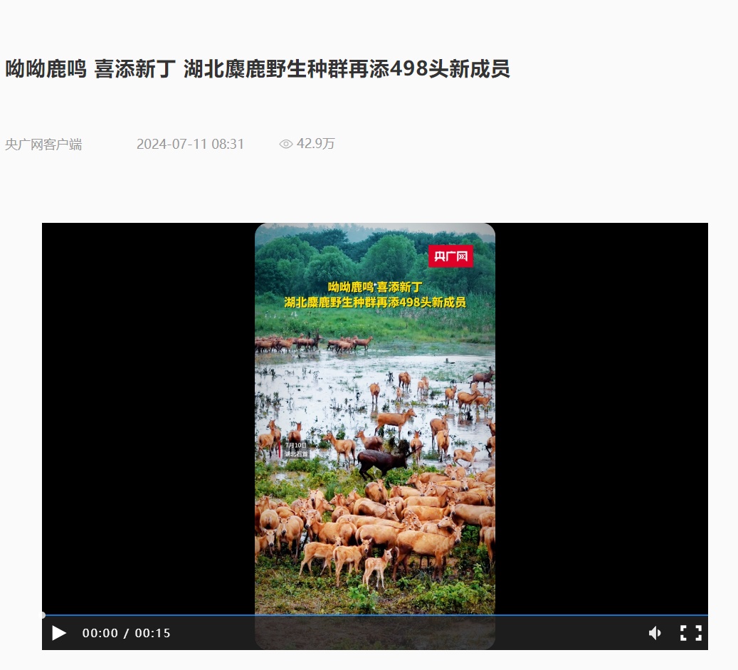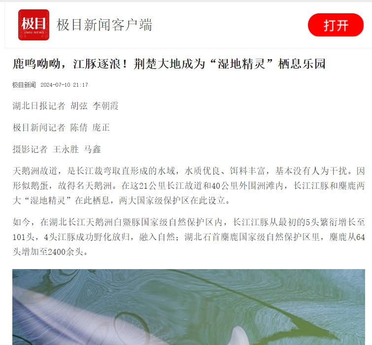 如今,在湖北长江天鹅洲白鱀豚国家级自然保护区内,长江江豚从最初的5头繁衍增长至101头,4头江豚成功野化放归,融入自然;湖北石首麋鹿国家级自然保护区里,麋鹿从64头增加至2400余头。