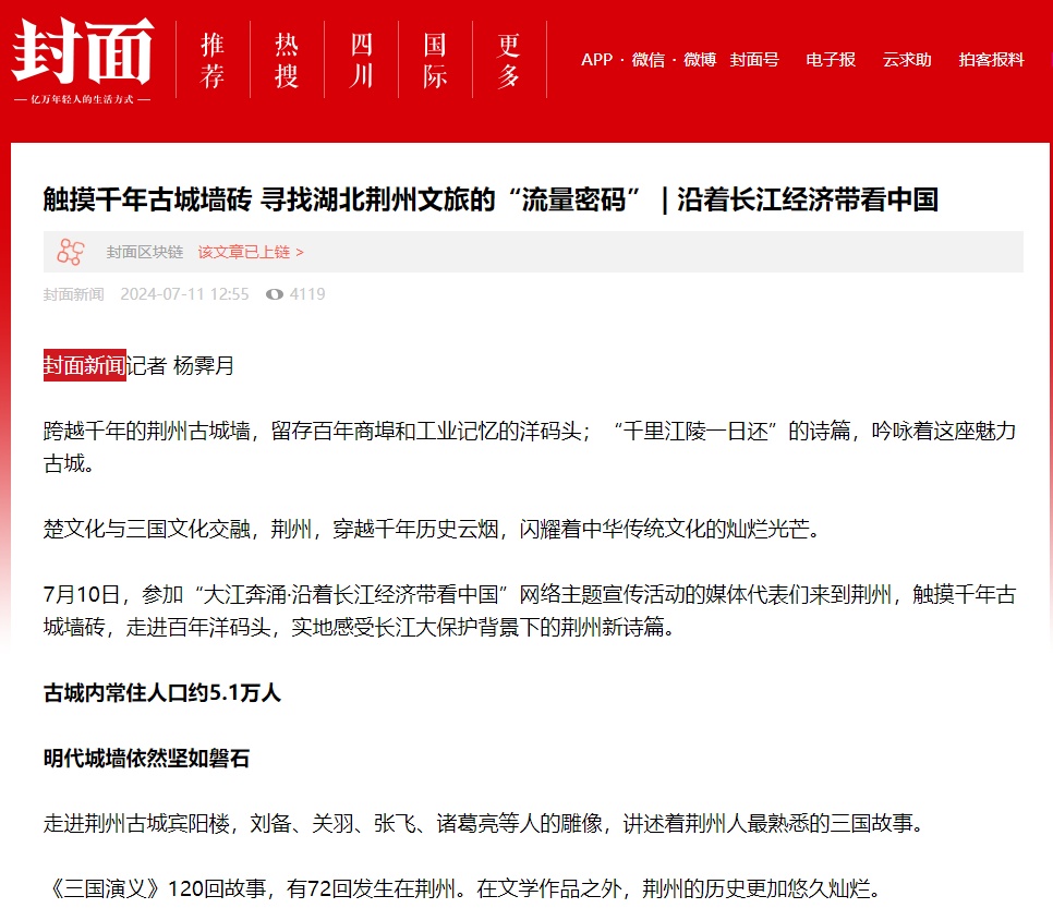 7月10日,参加“大江奔涌·沿着长江经济带看中国”网络主题宣传活动的媒体代表们来到荆州,触摸千年古城墙砖,走进百年洋码头,实地感受长江大保护背景下的荆州新诗篇。