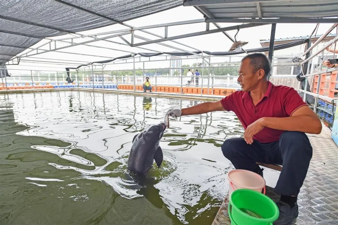 长江天鹅洲白鱀豚国家级自然保护区饲养员丁泽良正在喂养江豚。在他眼中,长江江豚如同自己的孩子。(极目新闻记者 马鑫 摄)