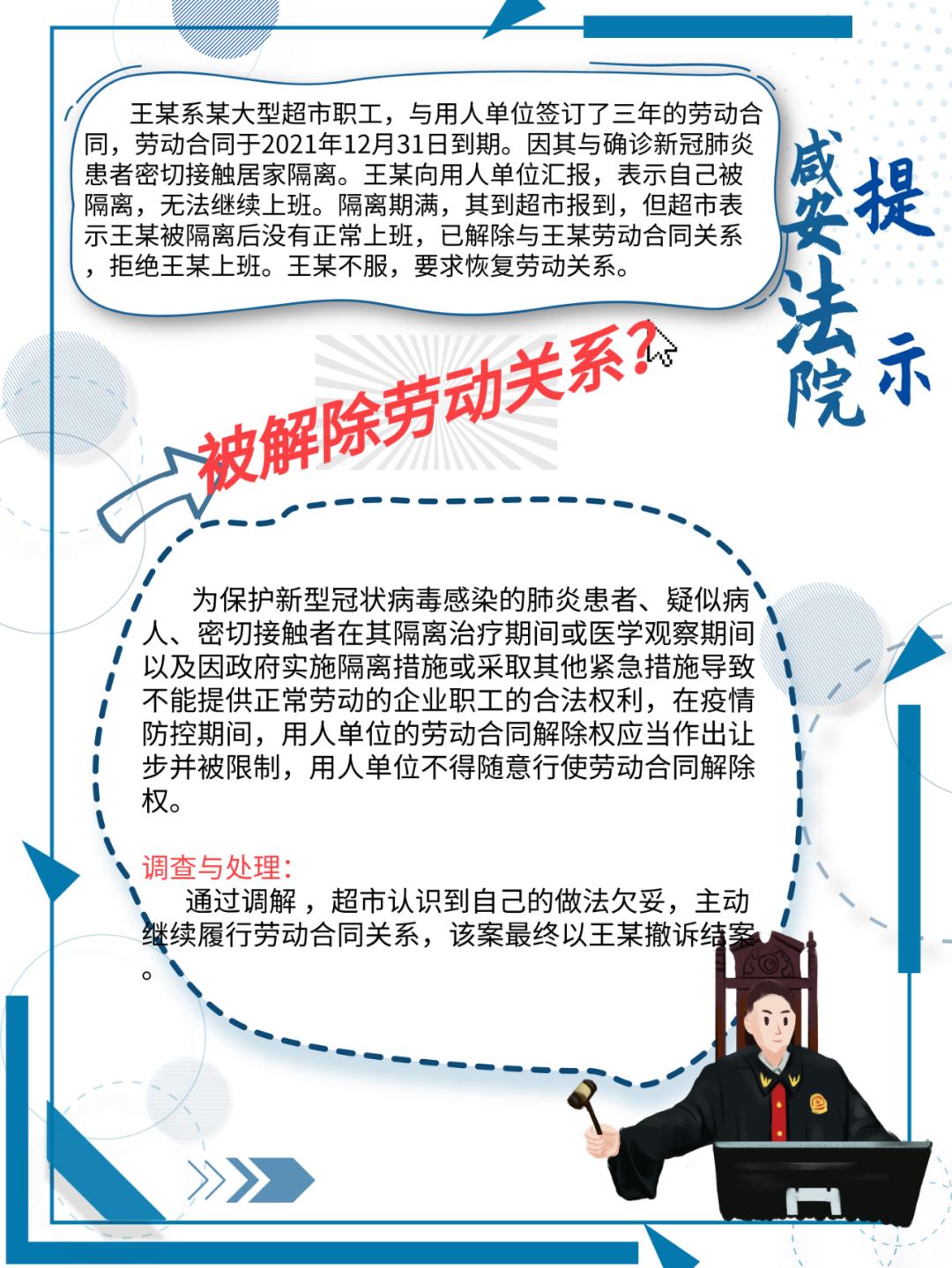 《中华人民共和国劳动合同法》第四十二条对用人单位的劳动合同解除权作出了限制,用以保护一些特定群体劳动者的合法权益。此次新型冠状病毒肺炎疫情,对劳动者和用人单位均产生了重大影响,特别是部分被确诊患有新型冠状病毒和因故被隔离的劳动者。若用人单位此时对新型冠状病毒感染的肺炎患者、疑似病人、密切接触者在其隔离治疗期间或医学观察期间以及因政府实施隔离措施或采取其他紧急措施导致不能提供正常劳动的劳动者解除动合同关系,无疑会让这些劳动者雪上加霜,让他们承担更为沉重的心理和经济负担。为此,人力资源社会保障部办公厅《关于妥善处理新型冠状病毒感染的肺炎疫情防控期间劳动关系问题的通知》第一条明确规定,对新型冠状病毒感染的肺炎患者、疑似病人、密切接触者在其隔离治疗期间或医学观察期间以及因政府实施隔离措施或采取其他紧急措施导致不能提供正常劳动的企业职工,企业不得依据劳动合同法第四十条、四十一条与职工解除劳动合同。在此期间,劳动合同到期的,分别顺延至职工医疗期期满、医学观察期期满、隔离期期满或者政府采取的紧急措施结束。故本案超市作出解除与王某劳动合同的决定,于情于理于法均无依据。