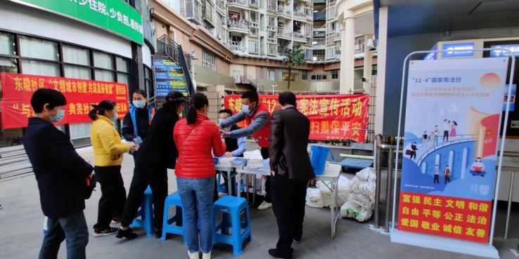 东晓街道东晓社区于12月3日在金鹏社康、君逸华府小区等地开展了“12·4 宪法宣传日” 活动。除了宣传宪法及与群众生产生活密切相关的法律知识,工作人员还将扫黑除恶、反恐反邪反诈骗、禁毒等知识融入,内容丰富,吸引众多居民驻足,共同学习。