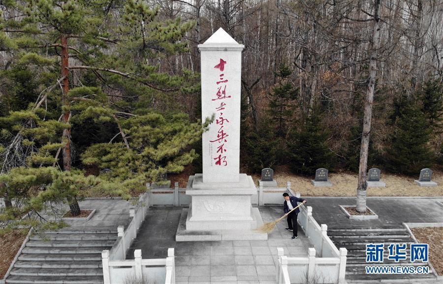 吉林省珲春市大荒沟村的刘国信老人在打扫十三烈士陵园(3月29日无人机拍摄)。 新华社记者 林宏 摄