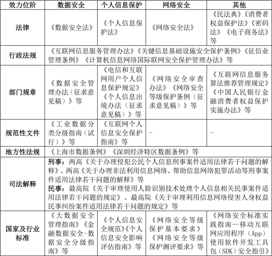除《网络安全法》《数据安全法》《个人信息保护法》三大方面以及配套的法律法规外,数据合规还涉及到《民法典》《密码法》《电子商务法》等其他法律。总体来看,数据合规涉及的法律法规较为庞杂,需要对此有一个系统性的把握。本文从涉及领域和法律位阶两个维度对现行规范归类汇总如下: