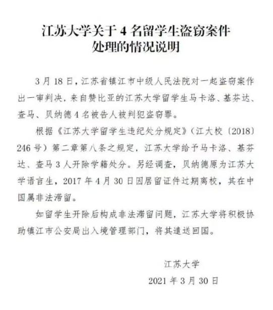 7.判决来了!四名留学生在中国超市7次偷盗洋酒15瓶,除了罚金,还被依法开除、遣送回国 日前,四名赞比亚留学生因在中国某超市里7次偷盗洋酒共15瓶,被法院一审判决盗窃罪成立,单处罚金6500元,引发关注。江苏镇江市中院发布情况说明称,基于4名被告人均认罪认罚、积极退赔和部分被告人有立功、自首等情节,依法对被告人单处罚金。目前4人遣送回国事宜,有关部门正在抓紧落实。同时,江苏大学发布情况说明称,给予3名被告人开除学籍处分,另一名被告人因居留证过期留校,属非法居留。有言论指出,留学生拿着中国给的优厚条件不好好学习还敢以身试法,依法开除、遣送回国,这就对了!(中国青年网)