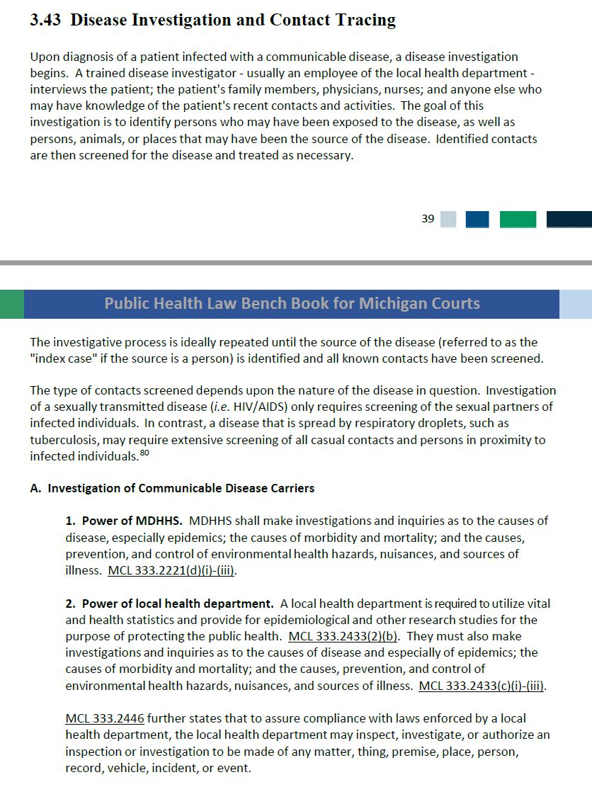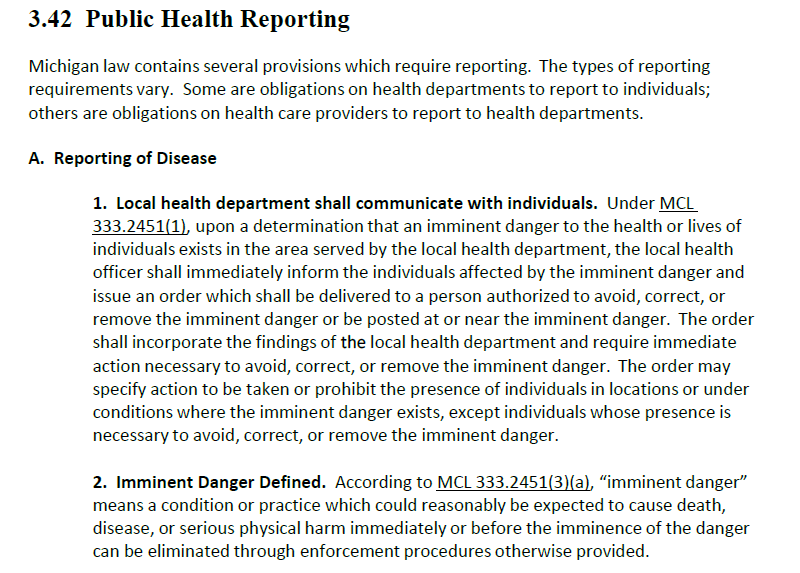 在“公共卫生报告和通知”这一节中,如果MDHHS认定存在“迫在眉睫的危险”,则密歇根州地方卫生官员有权立刻通知受该危险影响的个人,并发出“迫在眉睫危险令”,命令其作出降低或消除危险所必要的动作,这其中自然包括汇报与疾病相关的情况。