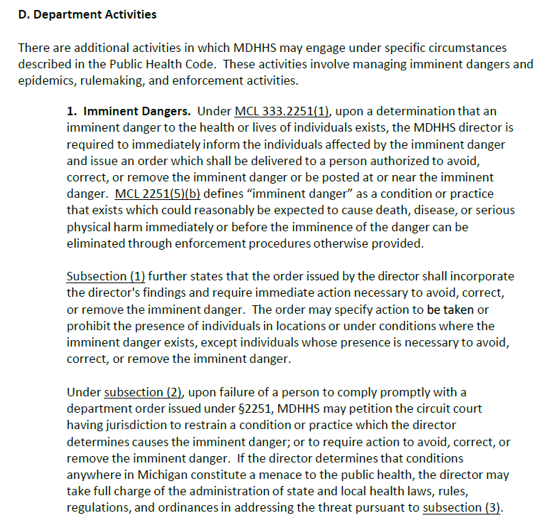从以下内容中看到,管理“迫在眉睫的危险”是密歇根州卫生服务部门(MDHHS)的主要职责之一。密歇根州州法对“迫在眉睫的危险”作出了定义,而且授权MDHHS发布命令要求相关个人作出降低或消除危险所必要的动作。