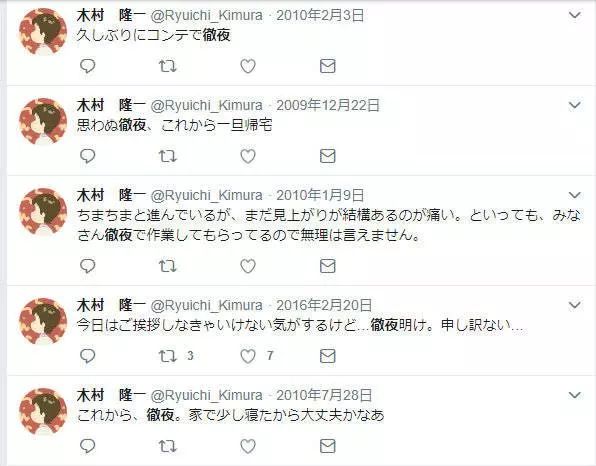 本来是挺有道理的话,但因为这两位导演有过节,所以网民知道他是讽刺驼鹿,于是翻出了木村之前表达自己连续通宵工作的推特。