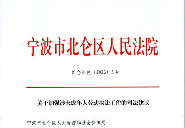 为维护正常劳动用工秩序,保护未成年人合法权益,为未成年人健康成长营造良好的社会环境,北仑法院向行业监管部门北仑区人力资源和社会保障局发出了司法建议: