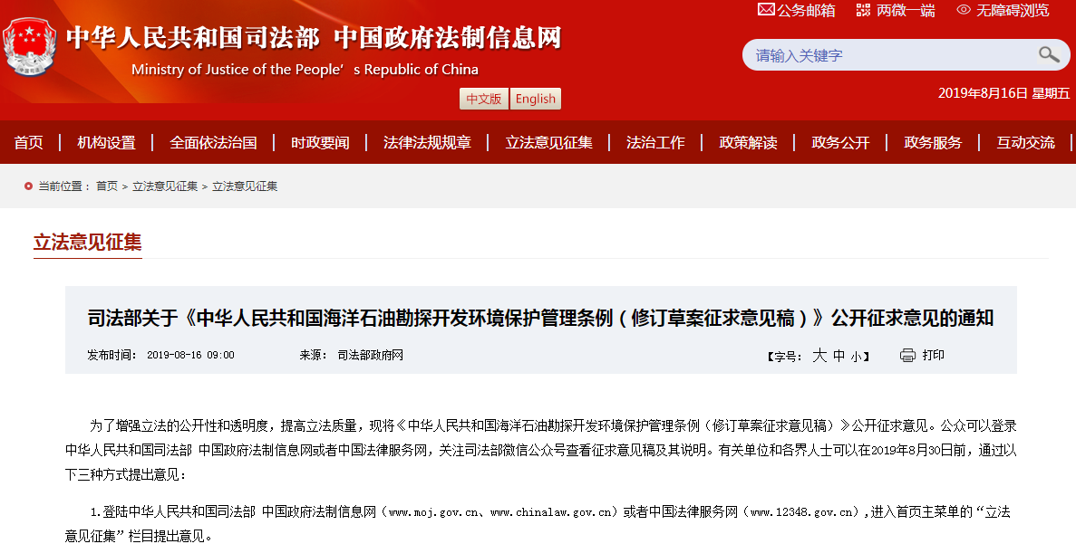 8月16日,《中华人民共和国海洋石油勘探开发环境保护管理条例(修订草案征求意见稿)》在中国政府法治信息网公开征求意见,起止时间为8月16日到8月30日。其中规定,特大溢油污染事故、重大溢油污染事故由国务院或者国务院指派有关部门负责调查。