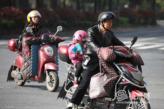 上学的路上,为了安确保出行安全,无论大人、小孩都自觉地佩戴好头盔。