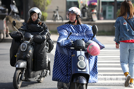 上班早高峰,在新塘路与环站东路十字路口,骑车市民装备齐全,有序通过路口。