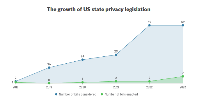 自2018年第一部综合性州法律《加州消费者隐私法》通过以来,美国各州有关隐私法案的提案数量每年都在增加。2018年,全美共提出两项法案,其中一项在加利福尼亚州通过并成为法律。2019年全美共提出15项法案。2020年全美共提出24项法案,其中一项以法律形式颁布。2021年全美共提出15项法案,其中两项在弗吉尼亚州和科罗拉多州通过并成为法律。2021年全美共提出59项法案,其中两项在犹他州和康涅狄格州通过并成为法律。2023年全美共提出54项法案,其中七项在特拉华州、印第安纳州、爱荷华州、蒙大拿州、俄勒冈州、田纳西州和得克萨斯州通过并成为法律。其中,仅有两个州——科罗拉多州和加利福尼亚州——将规则制定权授予给州检察长或隐私执法机构。