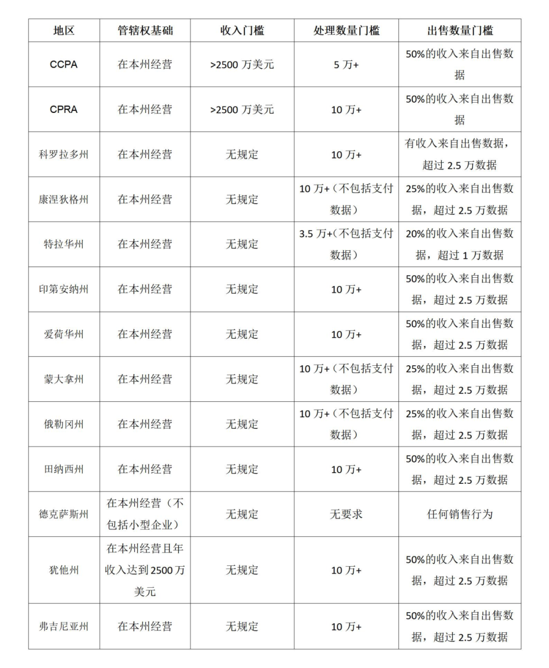 需要注意的是,本报告排除了部门性法案、针对特定行业的法案或针对特定用例的法案,如佛罗里达州的《数字权利法案》和华盛顿州的《健康数据法案》。虽然这两部法律以及其他法律同样对隐私权利做出规定,但它们针对的是特定类型的数据,因此不在统计之列。