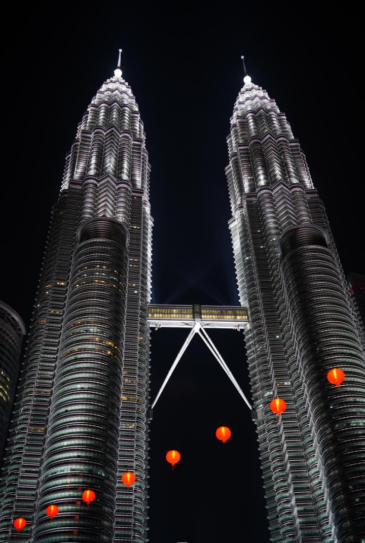 吉隆坡石油双塔曾是世界上最高的摩天大楼,地上共88层,由美国建筑设计师西萨·佩里所设计。双子塔表面大量使用了不锈钢与玻璃等材质,大楼如同两柄银色利剑直插云端,尤其是夜间的灯光效果,引来无数游客拍照留念。