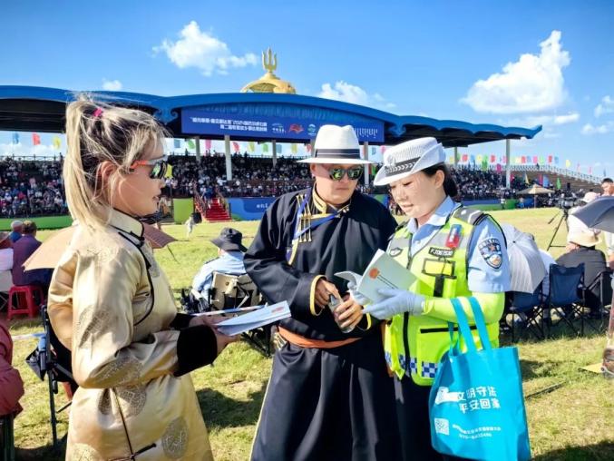 那达慕场地人头攒动、热闹非凡,宣传民警抓住时机,走进那达慕现场开展交通安全宣传活动,通过发放交通安全提示卡、蒙语版交通安全宣传资料的方式,与广大交通参与者面对面“拉家常、谈安全”,讲解酒醉驾、牲畜横穿道路、农用货车违法载人、无牌无证和不戴头盔等交通违法行为的危害和后果,并通过“以案说法”,引导大家在日常生活中养成良好的交通行为习惯,自觉遵守交通法律法规,安全文明出行。