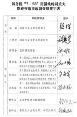 按照中央领导同志的重要指示精神和《生产安全事故报告和调查处理条例》(国务院令第493号)等有关法律法规规定, 725日 ,国务院批准成立了国务院“7·23”甬温线特别重大铁路交通事故调查组(以下简称事故调查组); 810日 ,根据调查工作需要,国务院第167次常务会议决定对事故调查组进行充实、加强。事故调查组由国家安全监管总局局长任组长,国家安全监管总局、监察部、工业和信息化部、电监会、全国总工会、浙江省人民政府各1名负责同志和3位曾担任过国家有关部门(单位)或地方政府主要负责人且熟悉铁路工作的老同志任副组长。事故调查组下设技术组、管理组、综合组。同时,聘请了12名铁路运输、电力、电气、自动化、通信、信号、安全管理、建筑等专业领域的专家组成专家组(其中有全国人大代表2名、全国政协委员1名、“两院”院士2名)。邀请最高人民检察院派员参加了事故调查工作。