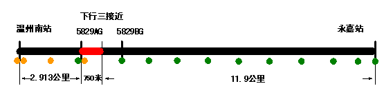 永嘉站至温州南站共 15.563公里 ,其中永嘉站至5829AG11.9公里 ,5829AG750米 ,5829AG至温州南站长 2.913公里 。
