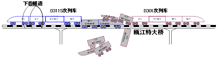 事故造成D3115次列车第1516位车辆脱轨,D301次列车第15位车辆脱轨(其中第23位车辆坠落瓯江特大桥下,第4位车辆悬空,第1位车辆除走行部之外车头及车体散落桥下;第1位车辆走行部压在D3115次列车第16位车辆前半部,第5位车辆部分压在D3115次列车第16位车辆后半部),动车组车辆报废7辆、大破2辆、中破5辆、轻微小破15辆,事故路段接触网塌网损坏、中断上下行线行车32小时35分,造成40人死亡、172人受伤。